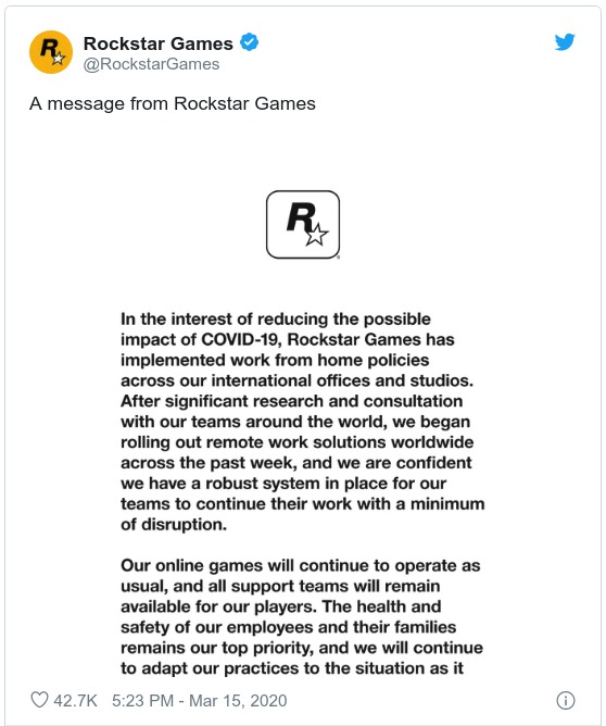 "In the interest of reducing the possible impact of COVID-19, Rockstar Games has implemented work from home policies across our international offices and studios. After significant research and consultation with our teams around the world, we began rolling out remote work solutions worldwide across the past week, and we are confident we have a robust system in place for our teams to continue their work with a minimum of disruption."
