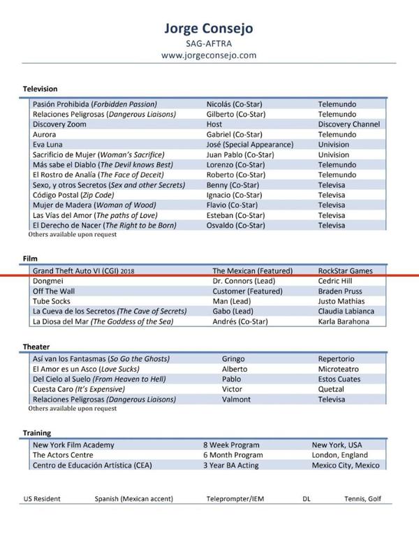 Reddit users noticed that a Spanish speaking actor Jorge Consejo listed GTA 6 in his CV on his official website. His role was a Mexican in 2018.