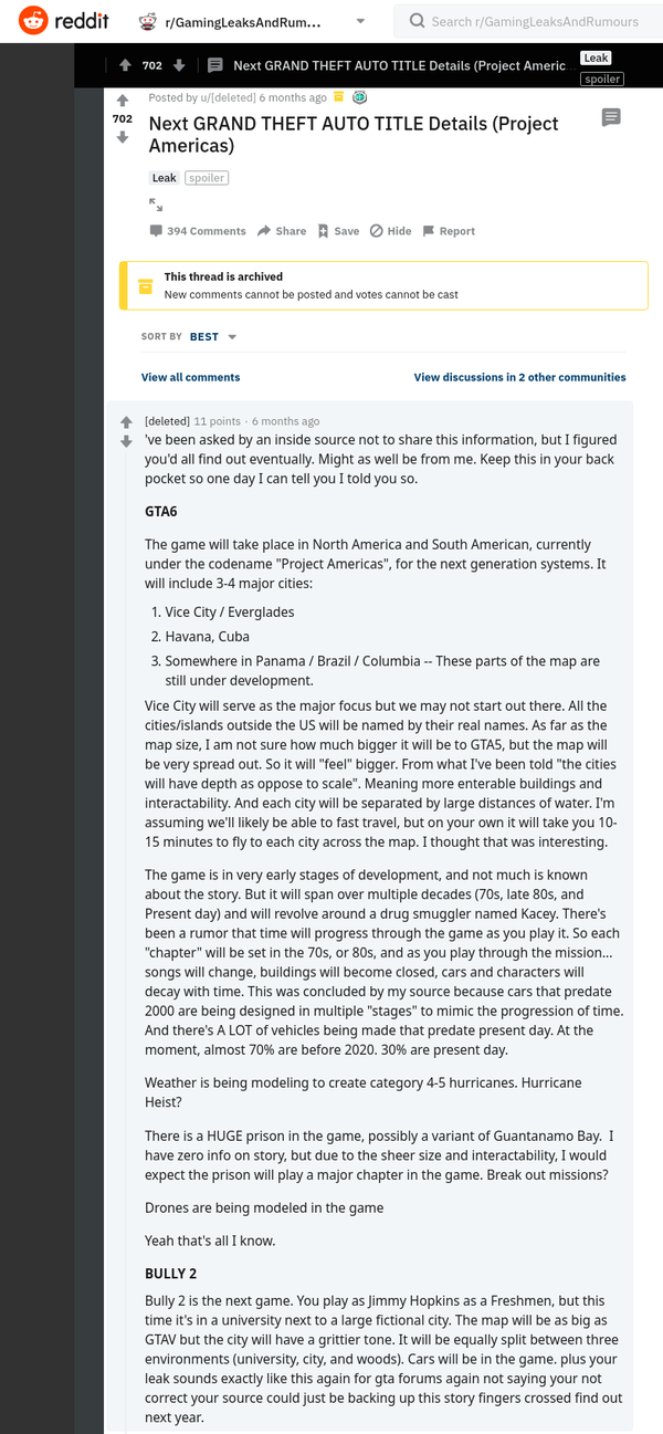 Another user on Reddit, gfk53, posted a leak about the upcoming GTA 6.