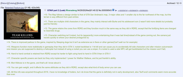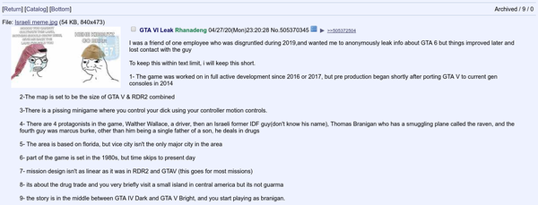Reddit users noticed two more leaks about GTA 6 on 4Chan website. The leaker states that he was a friend of one Rockstar employee who was disgruntled during 2019 and wanted to anonymously leak info about GTA 6 (as a revenge to the company?), but things improved later and the contact with the guy was lost. Here is the leak: